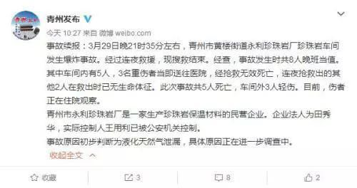 据山东省青州市人民政府新闻办公室官方微博消息,3月29日晚21时35分左右,青州市黄楼街道永利珍珠岩厂珍珠岩车间发生爆炸事故。此次事故共致5人死亡,3人轻伤。